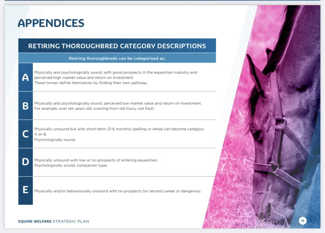 The classification of horses is an important tool because it allows RV to channel funding into different strategies for different horses. There is money available for euthanasia of Cat E horses while they are still with their trainers, which avoids the risks of mistreatment associated with these horses leaving racing and falling into the wrong hands. Behaviour and soundness strategies for horses still in training seek to reduce the number of Cat C and D horses.